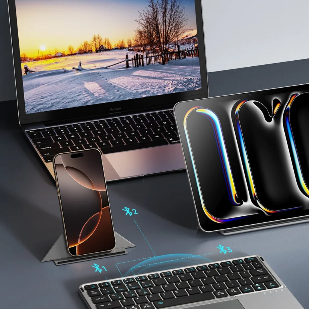 صُممت للحركة: خفيفة وقابلة للطي، تتصل بسهولة بالهاتف أو اللابتوب وتمنحك تجربة كتابة مريحة مع تحكم دقيق عبر لوحة اللمس — مثالية للعمل من أي مكان.
